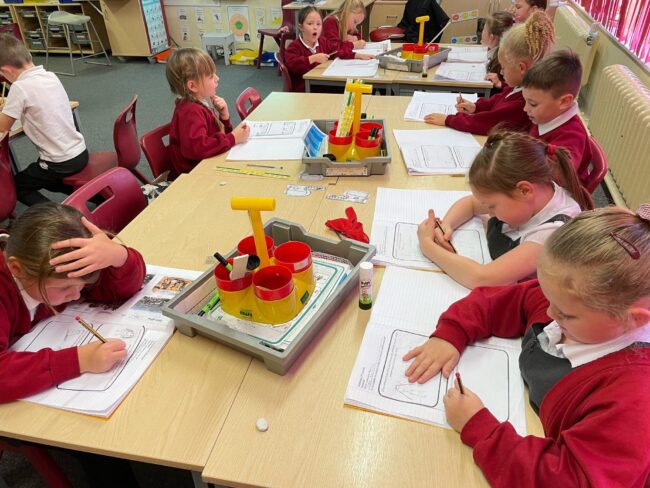 Year Three are looking at multiplication and division facts. Here, we are looking at sharing and grouping with concrete resources. Lot of fun!