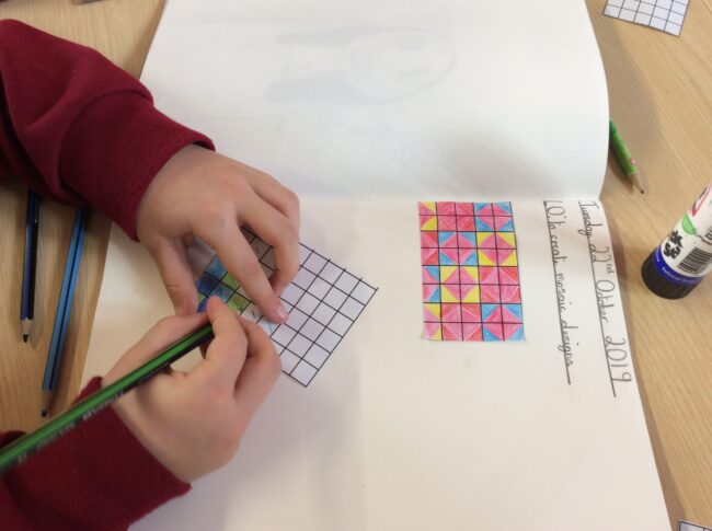 Year 4 have been learning about Roman mosaics and how the pictures and patterns are created using tesserae. They have created their own Roman mosaic designs using squared paper in preparation for their printing and tile work later in the topic.