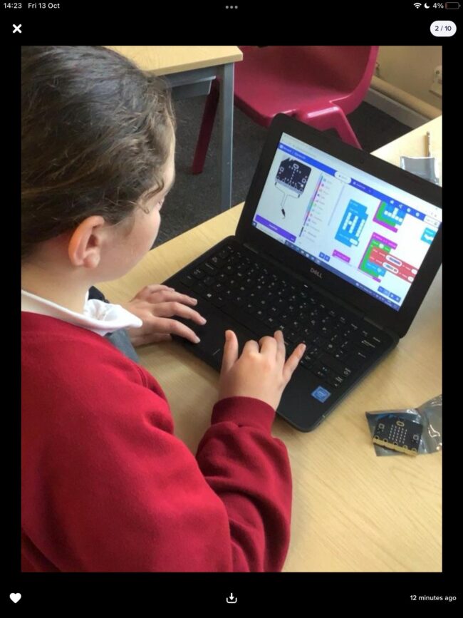Children have been creating code for a microbit, which is a circuit board that can do a multitude of things, such as count steps, play music, listen to sound and light up. Today, we have been practising making a stepmother, which plays music and congratulates you when you reach a certain number of steps.