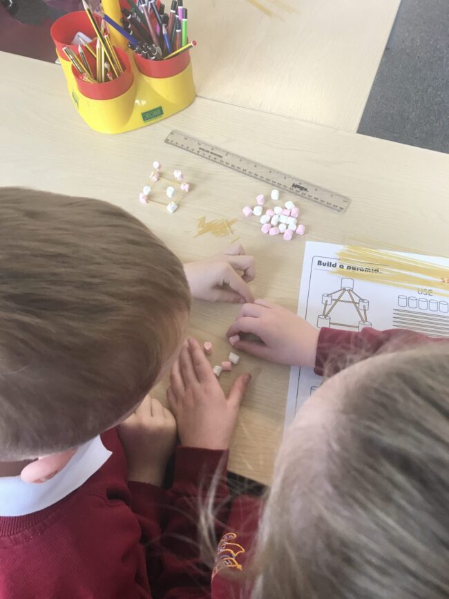 Year 2 have been challenged to make 3-d shapes using spaghetti and mini marshmallows! They are doing really well both with their constructions and in not eating the marshmallows!!!