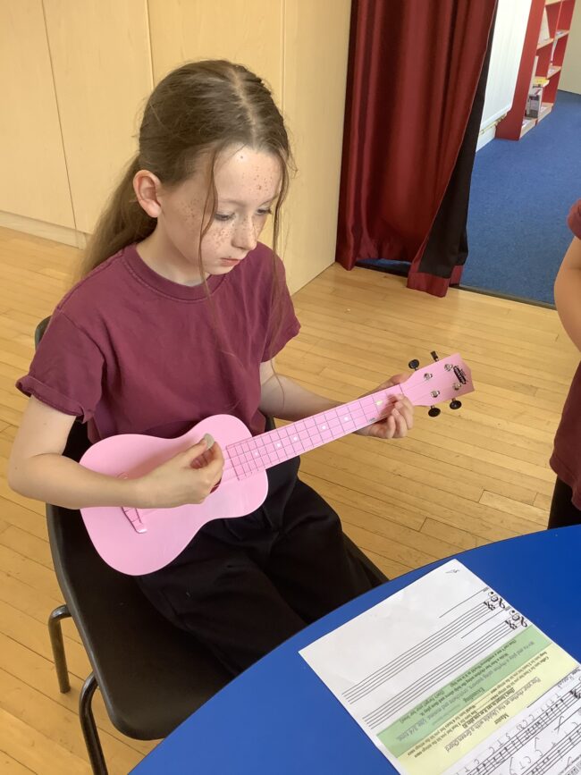 During their recent music lesson, the children were writing and playing a rhythm using different pitches on the ukuleles.