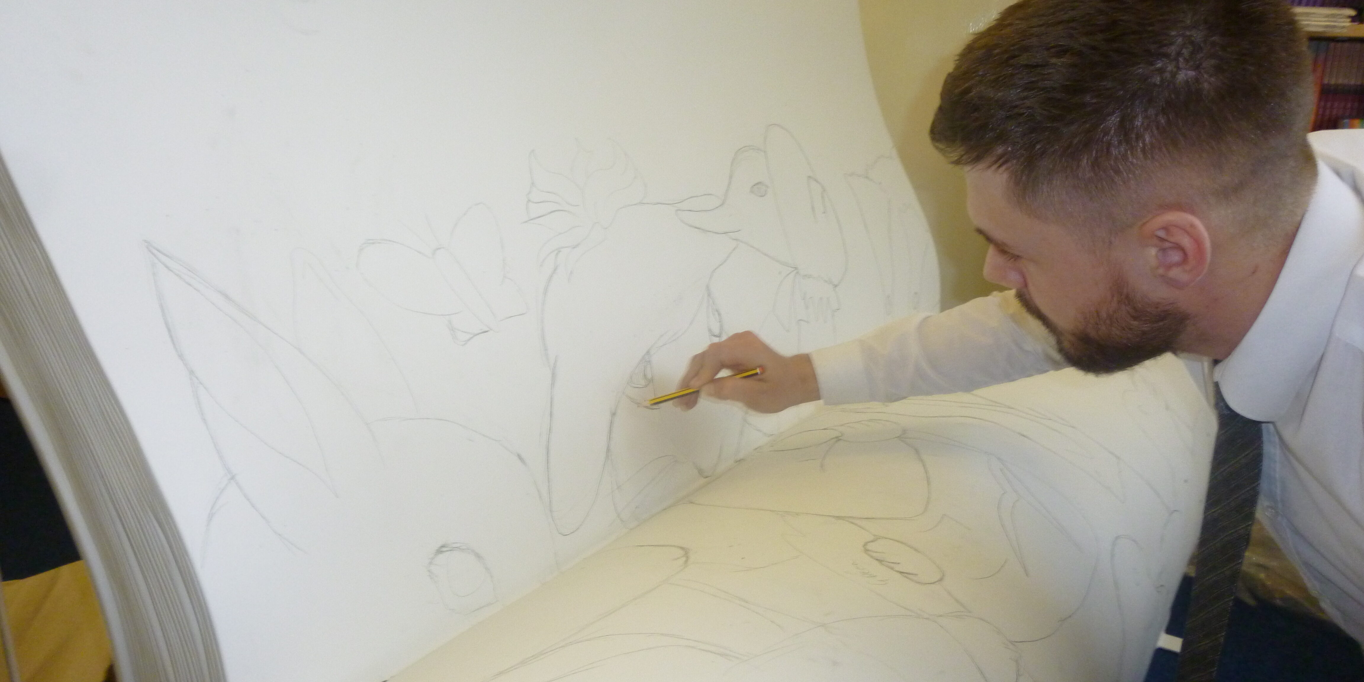 Jan312019 The Book Bench is well under way. Ellie, in Year 5 won the design competition with her Peter Rabbit design, which has been drawn this afternoon by Mr Frost.