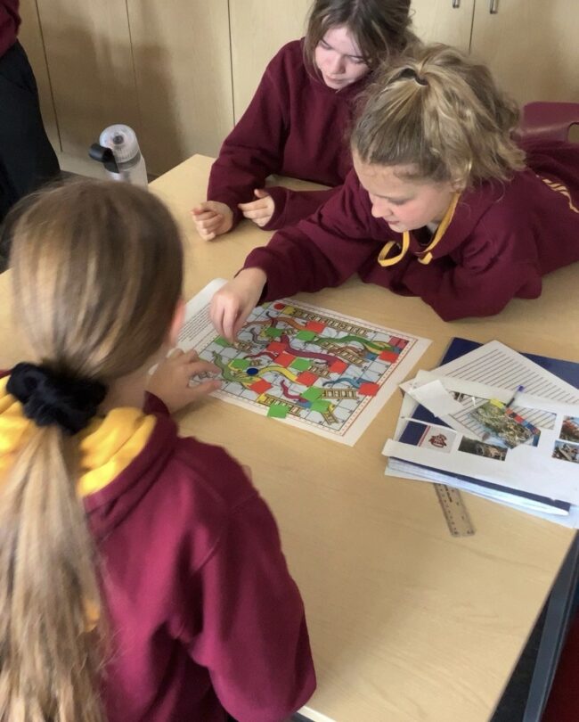 Children have continued their learning about Hinduism and Dharma (rebirth), Karma (what goes around comes around) and Moksha (heaven) by playing a game of Moksha Chittirum (snakes and ladders with a twist). Children drew good actions on green tiles and bad actions on red tiles. The green tiles were placed at the foot of the…
