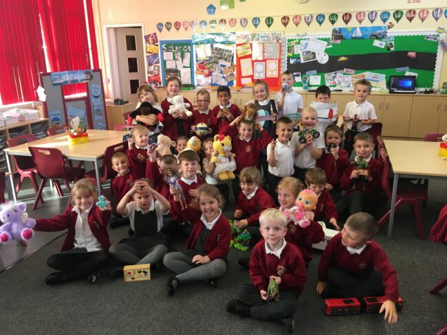 Year One started their topic on ‘Toys’ today by bringing in their own toys from home to play with and write about! They loved sharing their toys, talking about the materials they were made from, how old they were and why they liked them! What an interesting selection we had too – wooden dominoes, scary…