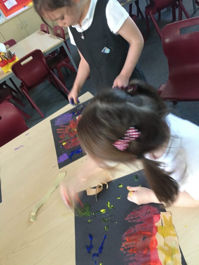 We used ‘Sparks in the Sky’, an ebook to inspire our firework pictures! We used handprints to paint a bonfire then adding whizzing and whooshing fireworks to the picture! We also talked about staying safe and taking care around fires and fireworks! Super work! 🎆