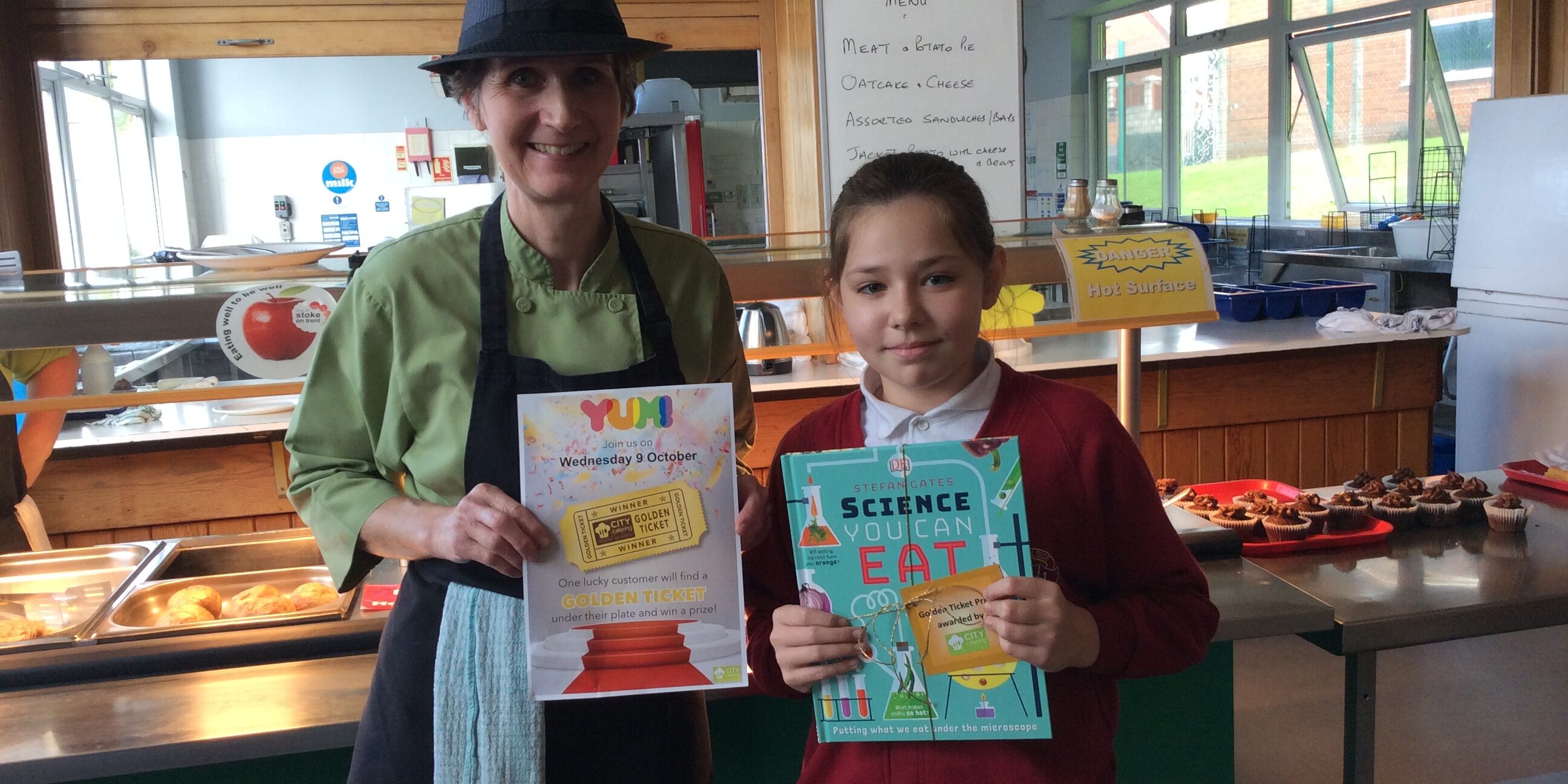 Congratulations to Lucy for finding the golden ticket under her plate at lunchtime today. This is one of many initiatives by City Catering to encourage children to choose our delicious, nutritious school meals. We hope that Lucy enjoys reading and sharing her book prize with her family.