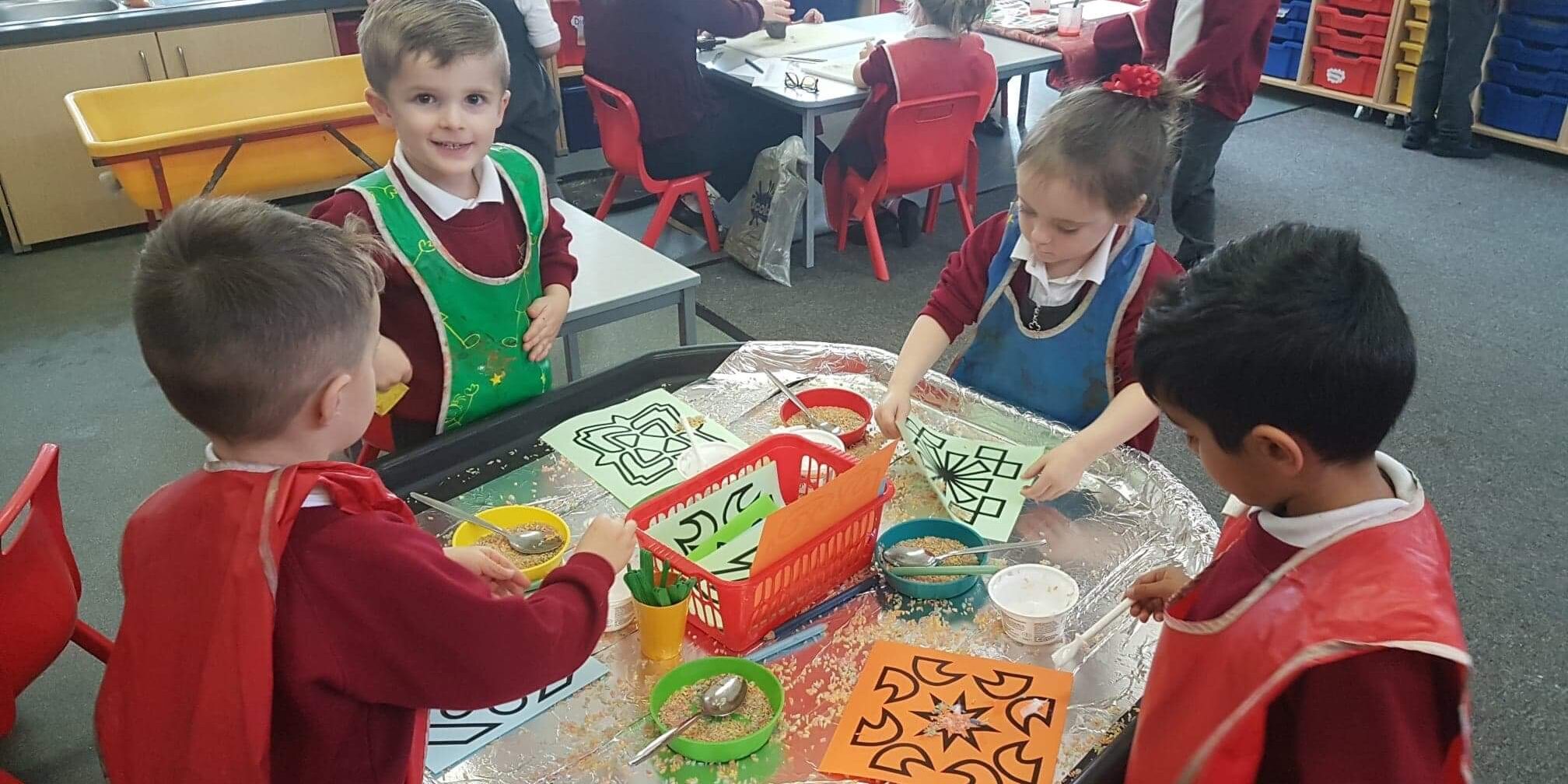 Nov122018Reception have been learning about the Hindu and Sikh festival of Divali today. They listened to the story of Rama and Sita and then created their own rangoli patterns and mendhi hands.