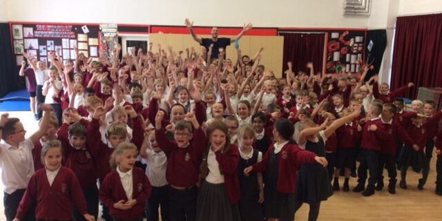 Paul Sturgess, the world’s tallest basketball player, has finished his visit to Hillside. He has inspired pupils to believe that each person can use their differences as an advantage and be successful if they’re prepared to work hard. He has delivered basketball workshops throughout the day and had photos with children. Here’s one of the whole school.
