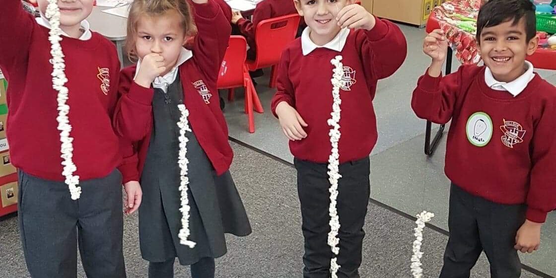 Jan92019Reception have had a ‘popping ‘ time today. As the weather has turned colder, we decided to pop some corn to make popcorn garlands for the woods. We enjoyed tasting the popcorn to make sure that it was OK for the birds!